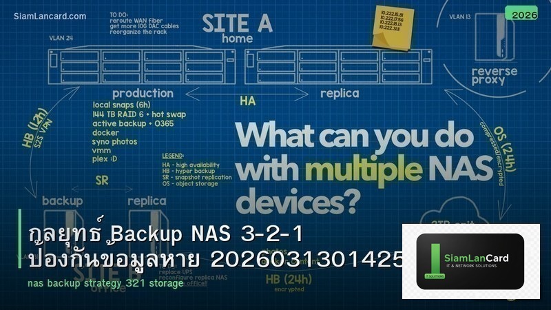 สุดท้าย สิ่งที่สำคัญที่สุดคือการ backup ข้อมูล ไม่ว่ากลยุทธ์ Backup NAS 3-2-1 ป้องกันข้อมูลหาย 20260313014252จะดีแค่ไหน hardware ทุกชิ้นมีวันเสีย ใช้กฎ 3-2-1 เสมอ: ข้อมูล 3 ชุด บน 2 media ต่างชนิด 1 ชุดอยู่ offsite เช่น backup ไปยัง Cloud หรือ NAS ที่บ้านอีกหลัง สำหรับธุรกิจ SMB ควรทดสอบ restore ข้อมูลอย่างน้อยเดือนละ 1 ครั้ง เพื่อให้มั่นใจว่า backup ทำงานถูกต้อง