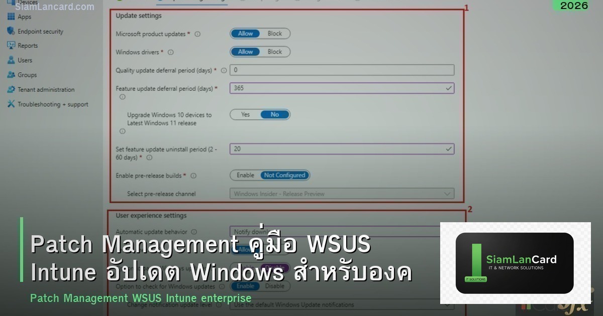 Patch Management เป็นพื้นฐาน Security ที่สำคัญที่สุด ใช้ WSUS (ฟรี) หรือ Intune Patch ทุกเดือน ทดสอบด้วย Ring Patch 3rd Party ด้วย และ Snapshot Server ก่อน Patch หากต้องการข้อมูลเพิ่มเติม ติดตามได้ที่ SiamLanCard.com
